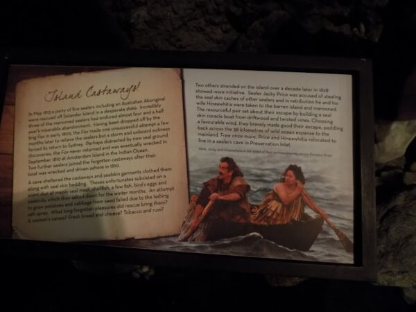 In the course of our time there we’d learn about James Caddell’s adoption by a Māori iwi on Rakiura (Stewart Island), about the marriage between Pākehā sealer Jack Price and his Māori wife Hinewhitia and the time they spent stranded on Hautere or Solander Island because Jack had been accused of stealing seal skin caches of other sealers. Their escape is described on this sign.