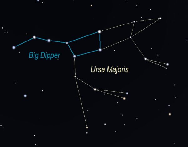 Pareidolia. This phenomenon makes regular appearances in the stream of this blog. If the term is new to you, here’s how Live Science defines it, “a brain phenomenon in which a person sees or hears something significant in a random image or pattern. Pareidolia is what causes peoples (sic) to see faces in inanimate objects, such as an image of the Virgin Mary in grilled cheese or the man in the moon,” and the patterns of the constellations are, in many ways, a classic example of it. I usually have little problem spotting the face in the rocks or the ice cream castles in the air. But when it comes to constellations or asterisms, I’m at a total loss. I think you could remove every other object from my field of view and I will still fail to see the pattern. Here’s an example of both a constellation (Ursa Major) and an asterism (Big Dipper) from the Milwaukee Astronomical Society.