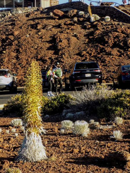 Outside the Visitor’s Center, we were treated to an up close view of the ‘āhinahina or silversword. Ninety percent of Hawaiian native flora are endemic and ‘āhinahina is among that group. It has long, slender leaves and a silver-white color (the Hawaiian word translates as ‘very gray’) and it has the unusual trait of only flowering once in its lifetime. The plant in the photo below is in its rosette stage that lasts for between 10 and 30 years.
