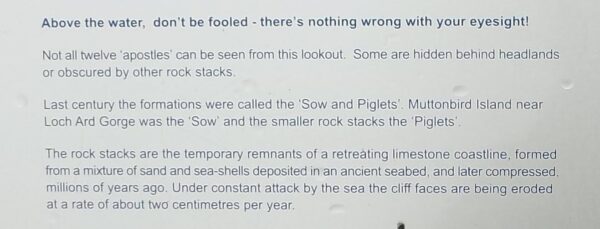 and not merely because the formations were once called the “Sow and Piglets” but by its admission that “Not all twelve ‘apostles’ can be seen from this lookout.” when, in fact, the most any non-Aboriginal person could have seen is nine! In 2024, erosion has reduced that number to seven. I think this picture captures six of them.