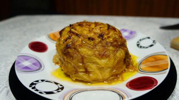 Like most Mediterranean and Middle Eastern cuisines Albania has another stuffed dish that uses grape leaves when they are in season. Many of you might be familiar with dolmas. In the fall, Albanians will switch from grape leaves to cabbage leaves – sometimes using pickled cabbage leaves (sarma) or, in other iterations, using fresh cabbage. The second dish at Odas Garden used fresh cabbage. It’s called lakër e mbushur and it looks like this.