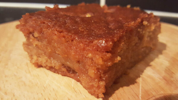 The cake batter contains butter, sugar, honey, eggs, flour, and baking soda and is every bit as dense as it looks. But it’s not done yet. You have to add walnuts before pressing it into your baking dish. Once it’s baked, you effectively drown it in a hot simple syrup that the cooling cake absorbs. So why did I call the name somewhat ironic? It derives from the Albanian word shëndetin which means health. I can think of no one in the west who would claim this cake to be healthy.