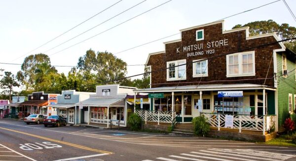 The town’s earliest buildings were designed in the Hawaiian Plantation style with false fronts that provided an image of stability. The building seen in this photo from the early 20th century