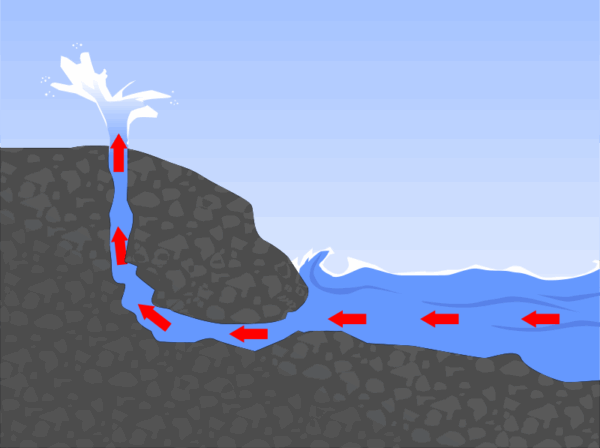 However, where a geyser draws its power from water heated by magma or hot rocks and ejects water and steam, a blowhole’s energy emanates from ocean waves entering a sea cave forcing it to eject water and air.