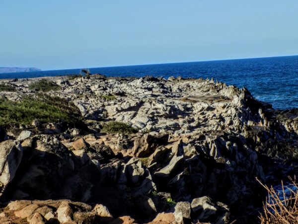 The Dragon’s Teeth lava formations at Makaluapuna Point are composed of one of the last flows of the now extinct Mauna Kahālāwai or West Maui Volcano that occurred approximately 320,000 years ago. It hardened in vertical, fin-like formations when it encountered strong ocean waves and winds. This caused it to cool rapidly in the sharp, jagged spikes seen in the photo.