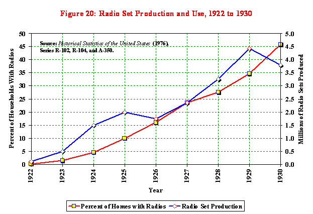 The pace of change proceeded at a dizzying rate. In 1922 less than 1% of American households owned a radio. By 1930, that number had topped 45 percent.