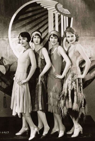 Films began to talk in the middle of the decade and by 1930 sound film production would outpace that of silent films. The sounds of jazz filled the air and women’s fashions made a dramatic shift from attire that might have looked like this