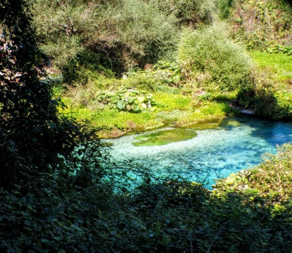 It’s time for a little geology lesson (and I promise to keep it brief) as we approach our next stop – Siri i Kaltër or the Blue Eye. (In this case I’ll be writing about the Blue Eye near Sarandë not the northern one near Theth.) The Blue Eye is a karst hole or doline. (In the US, you’re more likely to see the term sinkhole used to describe this phenomenon.) I took a deep dive into the Classical Karst landscape when our group was preparing to visit the Postonja Caves in Slovenia so I won’t repeat that here.
