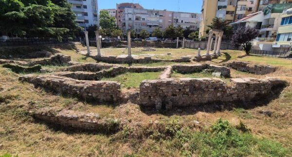 From there I took a short walk past the Sheshi Liria or Town Square to the ruins of the Byzantine Forum. Like the castle, Anastasius oversaw its construction in the early years of the sixth century. (Lest these major construction projects make you think he was a profligate spender, Anastasius was so frugal that at his death he left 23,000,000 solidi, or 320,000 pounds of gold in the imperial treasury for Justin, his chosen successor.)