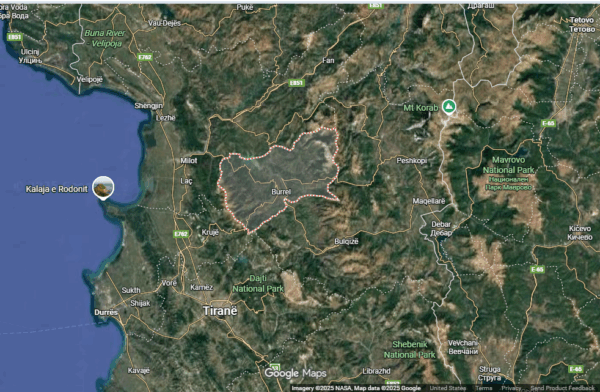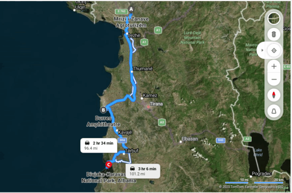 The first of two stops on today’s itinerary is the seaside city of Durrës and we’ll end the day at Divjaka-Karavasta National Park. This is our approximate route according to Bing Maps.