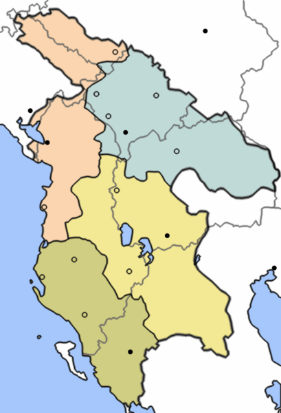 The First League proposed a consolidation of four Ottoman vilayets (the vilayet was an updated version of Ottoman administrative areas called eyalets) with mainly Albanian populations (seen below with modern borders in gray).