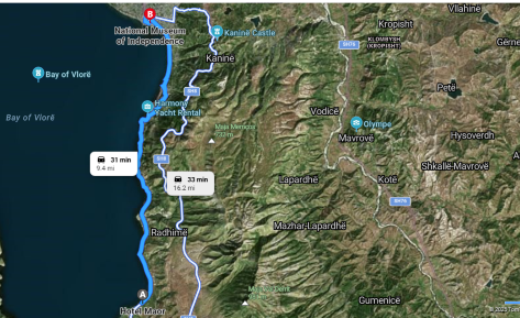 We saw a small group of people assembled near the hotel to our south and walked toward them. A few minutes later, they began moving en masse toward an approaching van. We followed. The van had no sign indicating that it was associated with any sort of public or private bus company and nothing that identified its destination as Vlora. However, since the route was relatively short (about 15km) and direct as this screenshot from Bing Maps shows,