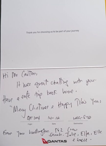 While I plan to take full informational advantage of the idle time I’m facing between my Wellington departure and Hawaii arrival, I want to relate one brief story about an event that occurred once previously, and, to my great astonishment, effectively repeated itself on the flight to Sydney. As happened between Melbourne and Auckland, near the end of this flight, a member of the cabin crew approached my seat, handed me this note thanking me for chatting with them.