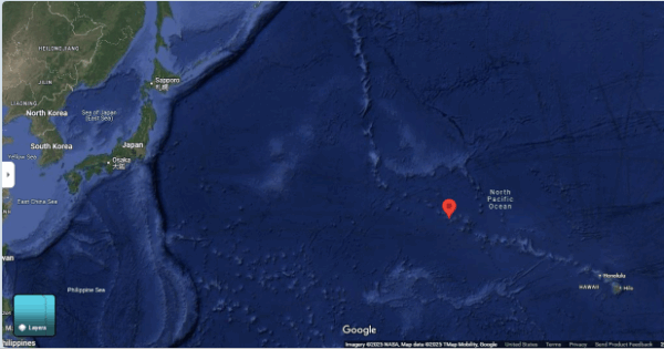 The marker is at Kure Atoll nearly 1,600 miles from Hawaii and generally considered the northernmost island that remains above sea level in the chain. (You can see Hilo on Hawaii in the lower right of the map.)
