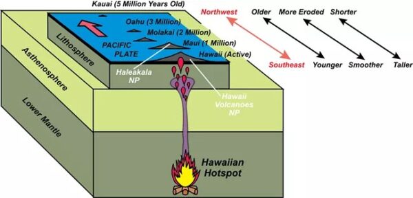As you can see from the diagram above, the Pacific Plate is moving northwest over the stationary hotspot. It’s racing along at a rate of about 2-4 inches per year or 32 miles in a million years. (Believe it or not, this is comparatively fast relative to Earth’s other plates that crawl along at 1-2 inches per year.) As the plate moves over the hotspot, carrying the old volcanoes with it, the hotspot is perfectly happy to make new volcanoes. This creates a chain of islands and seamounts, in this instance, the Hawaiian–Emperor seamount chain. Hawaii, the southeasternmost island, is currently over the hotspot and is volcanically active (at least occasionally). The islands to the northwest are progressively older, less active, and have experienced more erosion.