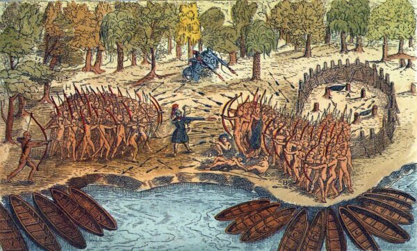 History generally reports that first contact between Europeans and the First Nations people in this area occurred in 1609 when French explorer Samuel de Champlain, who had allied with some Algonquin tribes, entered the region and engaged in a skirmish with the local Haudenosaunee near what is now Lake Champlain.