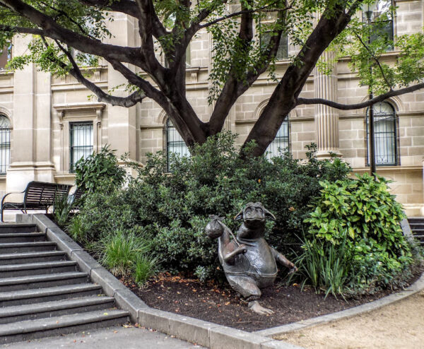 The first of these has been in its present location since 2012. It’s a casting based on Ron Brooks’ illustrations for Jenny Wagner’s 1973 children’s book called The Bunyip of Berkely’s Creek. While the book explores universal themes of identity and self-acceptance, it appears to use the mythical creature without acknowledging its Aboriginal routes and changes its nature from a fierce thing to be feared into something far more benign. Where the Bunyip of Berkeley’s Creek looks like this,