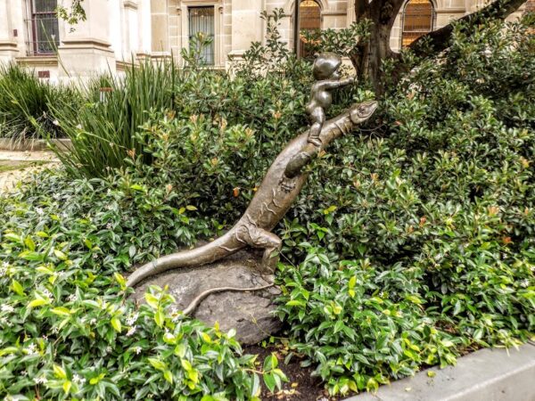 depicts Snugglepot riding Mr Lizard, a Goanna who is a great friend to all the babies. It’s just on the other side of the square in front of the library.