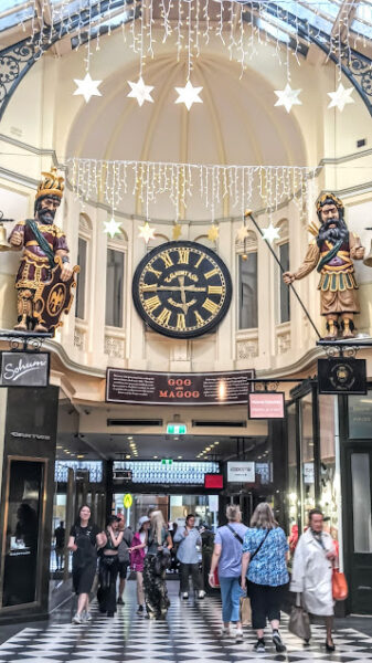 I had a tasty snack that satisfied my notoriously voracious sweet tooth and a cup of tea and then continued my walk. I found my way to the Royal Arcade on Elizabeth Street for a look at one last AO suggestion – the Gog and Magog Clock.