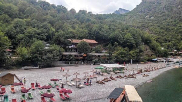 Our stop in Lezhë was necessarily brief because we had a date for lunch on our way to a boat ride across Lake Koman (Liqeni i Komanit in Albanian) and up to the Shala River (Lumi i Shalës) where we’d spend the next two nights. (Also, I don’t think there’s much more to do or see in Lezhë beyond the Skanderbeg Mausoleum.) Whether you would or wouldn’t consider the road to Lake Koman long is subjective. It’s windiness much less so. The roughly 135km from Lezhë to Koman required a drive of nearly four hours (excluding our lunch stop) meaning our average speed was about 38km/h (23 mph for my American friends). Admittedly, the road’s condition – mostly unpaved and rife with potholes and other obstacles contributed to our leisurely pace. We stopped for lunch at the family run Ledi’s Place