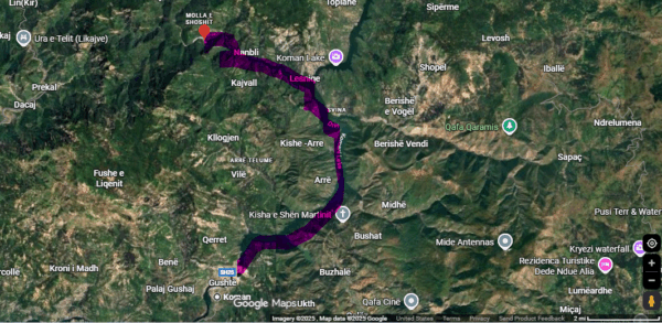 Once we finished our walk through the tunnel, we loaded our luggage and boarded a multi-passenger skiff with an outboard motor for the ride up the Drin to the Shala River. As nearly as I can reckon it this was our route.