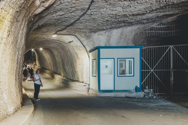 Once we neared the lake, we had to disembark from our bus and, either towing or carrying our luggage, walk through a tunnel that I’d estimate was 500 meters long with vehicular traffic approaching from the opposite direction. (I don’t recall any cars traveling in our direction.)