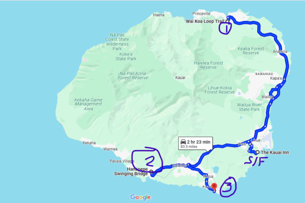 Kauai isn’t a very big island. It’s small enough that starting in one direction and appearing to backtrack to get someplace else – especially since there are places you can reach by car and places you can’t – isn’t at all onerous. The screen capture from Google maps shows my intended arc for the day.